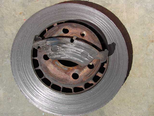 Don't wait until you hear grinding noises to have your brakes inspected. All brakes should be checked periodically for wear and condition. Just have look at this disc rotor and brake pad combination. Absolutely no pad material left, this customer is lucky to still be alive !